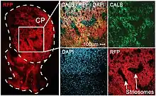 The striosomes (also referred to as striatal patches) are one of two complementary chemical compartments within the striatum (the other compartment is known as the matrix) that can be visualized by staining for immunocytochemical markers such as mu opioid receptors,[1] acetylcholinesterase,[2] enkephalin, substance P, limbic system-associated membrane protein (LAMP),[3] AMPA receptor subunit 1 (GluR1),[4] dopamine receptor subunits, and calcium binding proteins.[5] Striosomal abnormalities have been associated with neurological disorders, such as mood dysfunction in Huntington's disease,[6] though their precise function remains unknown. Recently studies have identified the presence of "exo-patch" neurons that are biochemically and genetically the same as striosomal neurons, but reside in the matrix compartment. [7] This study also characterized the different input and output connections of the striosome and matrix compartments, revealing that both regions have direct inputs to dopamine neurons (though the striosome inputs are somatic whereas the matrix targets distal dendrites). The authors also revealed unique inputs to the striosome from subcortical limbic structures like the amygdala and bed nucleus of the stria terminalis.