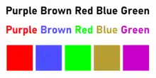 Another variant of the classic Stroop effect is the reverse Stroop effect. It occurs during a pointing task. In a reverse Stroop task, individuals are shown a page with a black square with an incongruent colored word in the middle—for instance, the word "red" written in the color green (red)—with four smaller colored squares in the corners.[43] One square would be colored green, one square would be red, and the two remaining squares would be other colors. Studies show that if the individual is asked to point to the color square of the written color (in this case, red) they would present a delay.[43] Thus, incongruently-colored words significantly interfere with pointing to the appropriate square. However, some research has shown there is very little interference from incongruent color words when the objective is to match the color of the word.[18]