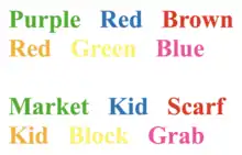 There are different test variants commonly used in clinical settings, with differences between them in the number of subtasks, type and number of stimuli, times for the task, or scoring procedures.[27][28] All versions have at least two numbers of subtasks. In the first trial, the written color name differs from the color ink it is printed in, and the participant must say the written word. In the second trial, the participant must name the ink color instead. However, there can be up to four different subtasks, adding in some cases stimuli consisting of groups of letters "X" or dots printed in a given color with the participant having to say the color of the ink; or names of colors printed in black ink that have to be read.[27] The number of stimuli varies between fewer than twenty items to more than 150, being closely related to the scoring system used. While in some test variants the score is the number of items from a subtask read in a given time, in others it is the time that it took to complete each of the trials.[27] The number of errors and different derived punctuations are also taken into account in some versions.[27]