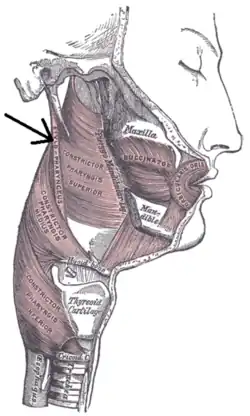 On the lateral pharyngeal wall, it is situated posterior to the superior constrictor muscle, and anterior to the buccopharyngeal fascia.[2]