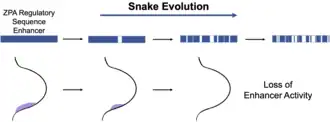 One theory suggests that the degradation of enhancer sequences may have contributed to the progressive limb loss in snake evolution. In particular, many studies have focused on the ZPA Regulatory Sequence (ZRS) - the enhancer of the Sonic Hedgehog gene (Shh). This long-range enhancer is required for proper limb formation in several vertebrate species, with mutations in this sequence known to cause limb deformities.[17] As such, this sequence is highly conserved across a variety of vertebrate species.