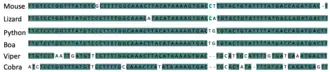 Comparisons of the core ZRS in several snake species to the mouse and lizard sequences shows the presence of snake-specific alterations.[23] The core ZRS proved to be mainly conserved in basal snakes like the boa constrictor and python, which still contain pelvic girdle bones.[22] In contrast, advanced snakes such as the viper and cobra, in which no skeletal limb structures remain, have a much higher rate of nucleotide changes when compared to the mouse and lizard ZRS.[22] It is thought that these cumulative changes in the snake ZRS are indicative of a progressive loss of function in this enhancer throughout snake evolution.[22]