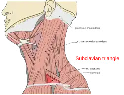 The subclavian triangle (or supraclavicular triangle, omoclavicular triangle, Ho's triangle), the smaller division of the posterior triangle, is bounded, above, by the inferior belly of the omohyoideus; below, by the clavicle; its base is formed by the posterior border of the sternocleidomastoideus.