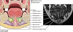 The sublingual space is a fascial space of the head and neck (sometimes also termed fascial spaces or tissue spaces). It is a potential space[1] located below the mouth and above the mylohyoid muscle, and is part of the suprahyoid group of fascial spaces.