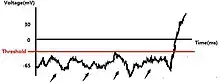 Neurons produce action potentials when their membrane potential increases past a critical threshold. In order for neurons to reach threshold for action potential to fire, enough sodium (Na+) ions must enter the cell through voltage gated sodium channels through membrane and depolarize the cell.[1] The threshold is reached to overcome the electrochemical equilibrium within a neuron, where there is a balance between potassium ions (K+) moving down their concentration gradient (inside the cell to outside), and the electrical gradient that prevents K+ from moving down its own gradient.[2] Once the threshold value is reached, an action potential is produced, causing a rapid increase of Na+ enters the cell with more Na+ channels along the membrane opening, resulting in a rapid depolarization of the cell.[1] Once the cell has been depolarized, voltage-gated sodium channels close, causing potassium channels to open; K+ ions then proceed to move against their concentration gradient out of the cell.[3]