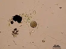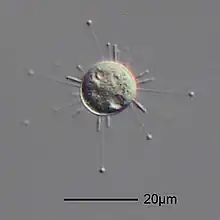 Suctoria are ciliates that become sessile in their developed stage and then lose their redundant cilia. They feed by extracellular digestion.[1] They were originally thought to feed by suction – hence their name.[2] In fact, they use specialized microtubules to ensnare and manipulate their prey.[2] They live in both freshwater and marine environments, including some that live on the surface of aquatic animals, and typically feed on other ciliates. Instead of a single cytostome, each cell feeds by means of several specialized tentacles. These are supported by microtubules and phyllae, and have toxic extrusomes called haptocysts at the tip, which they attach to prey. They then suck the prey's cytoplasm directly into a food vacuole inside the cell, where they digest and absorb its contents. Most suctoria are around 15-30 μm in size, with a non-contractile stalk and often a lorica or shell.