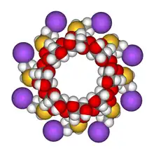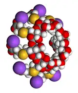 Right: Space-filling model of a sugammadex sodium molecule in the same orientation.