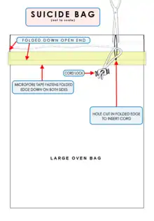 A suicide bag, also known as an exit bag or hood,[1][2] is part of a euthanasia device consisting of a large plastic bag with a drawcord used to die by suicide through inert gas asphyxiation. It is usually used in conjunction with a flow of an inert gas that is lighter or less dense than air, like helium or nitrogen. Continuing to breathe expels carbon dioxide and this prevents the panic, sense of suffocation and struggling before unconsciousness, known as the hypercapnic alarm response[3]: 45 caused by the presence of high carbon dioxide concentrations in the blood.[3] This method also makes the direct cause of death difficult to trace if the bag and gas canister are removed before the death is investigated. While asphyxiation by helium can be detected at autopsy, there is currently no test that can detect asphyxiation by nitrogen. For this reason, nitrogen is commonly the preferred choice for people who do not want the cause of death established.[4][5][6]