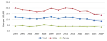 On average, adjusted for age, The Central Statistics Office provided the overall suicide rate has had a decreasing trend, from 13.5 per 100,000 population in 2001 to 10.0 in 2020.[1]