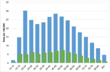 In 2020, 504 people in Ireland died from suicide.[1] 72.6% of these deaths by suicide were males.[1] Suicide was the leading cause of death in Ireland in 2020 for those aged from 15 to 34 years old.[1] The greatest proportion of these deaths by suicide in Ireland in 2020 were aged between 40 and 44 years old, at a proportion of 12.3% of the overall suicide rate in Ireland for that year.[1] The proportion of deaths due to suicide for females rose by 8.6% between 2012 and 2020, with females accounting for over a quarter of suicides in Ireland in 2020.[1] Seven in every ten of the 504 people who died by suicide in Ireland in 2020 were 35-years-old and over.[1]
