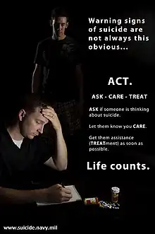 The traditional approach has been to identify the risk factors that increase suicide or self-harm, though meta-analysis studies suggest that suicide risk assessment might not be useful and recommend immediate hospitalization of the person with suicidal feelings as the healthy choice.[13] In 2001, the U.S. Department of Health and Human Services, published the National Strategy for Suicide Prevention, establishing a framework for suicide prevention in the U.S. The document, and its 2012 revision, calls for a public health approach to suicide prevention, focusing on identifying patterns of suicide and suicidal ideation throughout a group or population (as opposed to exploring the history and health conditions that could lead to suicide in a single individual).[14] The ability to recognize warning signs of suicide allows individuals who may be concerned about someone they know to direct them to help.[15]