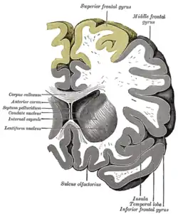 ![]() Coronal section through anterior cornua of lateral ventricles. Superior frontal gyrus is shown as yellow. | |