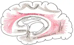 ![]() Diagram showing principal systems of association fibers in the cerebrum. (Sup. longitudinal fasc. labeled at center top.) | |