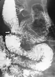- Upper gastrointestinal series showing extreme duodenal dilation (white arrow) abruptly preceding constriction by the SMA.