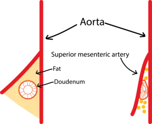 Superior mesenteric artery (SMA) syndrome is a gastro-vascular disorder in which the third and final portion of the duodenum is compressed between the abdominal aorta (AA) and the overlying superior mesenteric artery. This rare, potentially life-threatening syndrome is typically caused by an angle of 6–25° between the AA and the SMA, in comparison to the normal range of 38–56°, due to a lack of retroperitoneal and visceral fat (mesenteric fat). In addition, the aortomesenteric distance is 2–8 millimeters, as opposed to the typical 10–20.[1] However, a narrow SMA angle alone is not enough to make a diagnosis, because patients with a low BMI, most notably children, have been known to have a narrow SMA angle with no symptoms of SMA syndrome.[2]