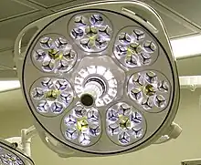 Many operating room lights used halogen lamps[1][2] or xenon lamps,[3] some with backup lamps that operated in case of lamp failure[4] until the advent of Light-emitting diodes as light sources since 2007[5] which remove the problem of heat radiation and reduce energy requirements.[6] Early LED surgical lamps suffered from color shadows since several LEDs with distinct colors and their own reflectors were used but modern LED surgical lamps do not have this problem.[7][2] Surgical lights can have cameras that are pointed at the surgical field,[8] and many surgical lights can be used with disposable handles.[9]