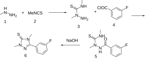 - ↑ Louks DH, Stolz-Dunn SK (2007). "Kinetics for Scale-Up of a One-Pot Pathway to 5-(3-Fluorophenyl)-2,4-dihydro-2,4-dimethyl-3 H -1,2,4-triazole-3-thione Using a Hybrid Model of Parallel and Consecutive Reactions". Organic Process Research & Development. 11 (5): 877–884. doi:10.1021/op700101g.