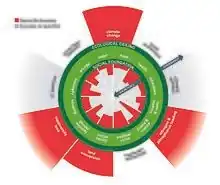 The wedding cake model for the sustainable development goals is similar to the nested ellipses diagram, where the environmental dimension or system is the basis for the other two dimensions.[43]