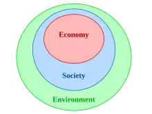 The diagram with three nested ellipses indicates a hierarchy between the three dimensions of sustainability: both economy and society are constrained by environmental limits[42]