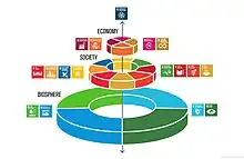 Agenda 2030 from 2015 also viewed sustainability in this way. It sees the 17 Sustainable Development Goals (SDGs) with their 169 targets as balancing "the three dimensions of sustainable development, the economic, social and environmental".[41]