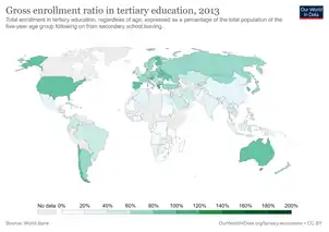 In terms of the progress made, global participation in tertiary education reached 224 million in 2018, equivalent to a gross enrollment ratio of 38%.[12] North Africa and West Asia are among the top regions with the most rapid expansion of tertiary education participation since 2013.[12]