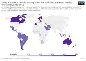 World map for indicator 4.1.1 in 2015 - Percentage of pupils in early primary education grades (2 or 3) achieving at least a minimum proficiency level in reading.[2]
