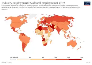 The industry employment in the world hasn't drastically changed. In 1991, the industry employment made up around 21% of total employment in the world, while in 2017, the industry employment made up 22% of total employment in the world.[13]