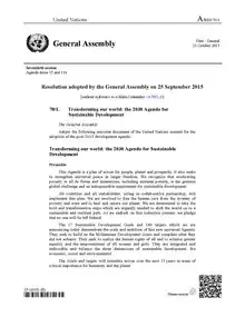 - ↑ United Nations (2015) Resolution adopted by the General Assembly on 25 September 2015, Transforming our world: the 2030 Agenda for Sustainable Development (A/RES/70/1 Archived 28 November 2020 at the Wayback Machine)