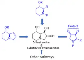 Despite the small size of swaisonine, the synthesis of this molecule and its analogues is quite challenging due to the presence of four chiral centers. In most cases, synthesis implies the use of sugars, chiral aminoacids as starting compounds, or chiral catalysts to induce chirality.The swainsonine synthesis was systemazed by three common precursors: 8-oxy-hexahydroindolizines, N-protected-3-oxy-2-substituted-piperidines and 2-substituted-pyrrolidine-3,4-protected-diols.[14]