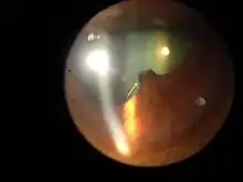 Ocular synechia is an eye condition where the iris adheres to either the cornea (i.e. anterior synechia) or lens (i.e. posterior synechia).[1][2] Synechiae can be caused by ocular trauma, iritis or iridocyclitis and may lead to certain types of glaucoma. It is sometimes visible on careful examination but usually more easily through an ophthalmoscope or slit-lamp.
