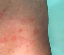 Secondary syphilis occurs approximately four to ten weeks after the primary infection.[3] While secondary disease is known for the many different ways it can manifest, symptoms most commonly involve the skin, mucous membranes, and lymph nodes.[23] There may be a symmetrical, reddish-pink, non-itchy rash on the trunk and extremities, including the palms and soles.[3][24] The rash may become maculopapular or pustular.[3] It may form flat, broad, whitish, wart-like lesions on mucous membranes, known as condyloma latum.[3] All of these lesions harbor bacteria and are infectious.[3] Other symptoms may include fever, sore throat, malaise, weight loss, hair loss, and headache.[3] Rare manifestations include liver inflammation, kidney disease, joint inflammation, periostitis, inflammation of the optic nerve, uveitis, and interstitial keratitis.[3][25] The acute symptoms usually resolve after three to six weeks;[25] about 25% of people may present with a recurrence of secondary symptoms.[23][26] Many people who present with secondary syphilis (40–85% of women, 20–65% of men) do not report previously having had the classical chancre of primary syphilis.[23]