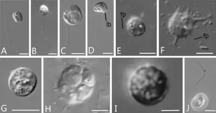 Syssomonas multiformis is a species of unicellular protists with naked cells (lacking any shell or scales) that presents with a variety of life forms during their complex life cycle. These forms include: round flagellate cells (7–14 μm in diameter) with one posterior flagellum, amoeboflagellate (i.e. with both flagella and pseudopodia) cells, amoeboid non-flagellar cells, and spherical cysts. They can also form clusters of multiple cells.[1][2]
