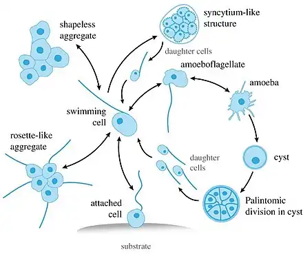 The amoeboid stage can retract its filopodia and become a round cyst, in which palintomic cell division (i.e. rapid cell divisions without cytoplasmic growth in between, a characteristic of animal embryonic cleavage)[3] can occur, generating 2, 4, 8 or 16 flagellated cells that are released from inside the cyst.[2]