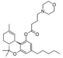 THC morpholinylbutyrate (SP-111, Δ9-THC-O-[4-(morpholin-4-yl)butyrate]) is a synthetic derivative of tetrahydrocannabinol, developed in the 1970s. It is a prodrug which is converted into THC inside the body, and was one of the first derivatives of THC that is able to form water-soluble salts, giving it a significant advantage over THC for some applications. However, it is less potent than THC and the metabolic conversion to THC is relatively slow and variable, giving it unpredictable pharmacokinetics which has limited its research applications.[1][2][3][4]