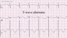 In cardiology, T wave alternans (TWA) is a periodic beat-to-beat variation in the amplitude or shape of the T wave in an electrocardiogram (ECG or EKG). TWA was first described in 1908. At that time, only large variations ("macroscopic" TWA) could be detected. Those large TWAs were associated with increased susceptibility to lethal ventricular tachycardias.