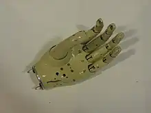 Tactile discrimination is the ability to differentiate information through the sense of touch. The somatosensory system is the nervous system pathway that is responsible for this essential survival ability used in adaptation.[1] There are various types of tactile discrimination. One of the most well known and most researched is two-point discrimination, the ability to differentiate between two different tactile stimuli which are relatively close together.[2] Other types of discrimination like graphesthesia and spatial discrimination also exist but are not as extensively researched.[3] Tactile discrimination is something that can be stronger or weaker in different people and two major conditions, chronic pain and blindness, can affect it greatly. Blindness increases tactile discrimination abilities which is extremely helpful for tasks like reading braille.[4] In contrast, chronic pain conditions, like arthritis, decrease a person's tactile discrimination.[5] One other major application of tactile discrimination is in new prosthetics and robotics which attempt to mimic the abilities of the human hand. In this case tactile sensors function similarly to mechanoreceptors in a human hand to differentiate tactile stimuli.[6]