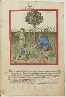The Taccuinum Sanitatis is a medieval handbook mainly on health aimed at a cultured lay audience. The text exists in several variant Latin versions, the manuscripts of which are profusely illustrated. "Neither religious nor scientific motives could explain the incentive to create such an image; only a cultured lay audience [...] could have commissioned and then perused these delightful pages."[1] Numerous European versions were made in increasing numbers in the 14th and 15th centuries.[2] Taqwīm aṣ‑Ṣiḥḥa (Arabic: تقويم الصحة, lit. 'Maintenance of Health') is originally an 11th-century Arab medical treatise by ibn Butlan of Baghdad.[3] In the West, the work is known by the Latinized name taken by its translations: Tacuinum (sometimes Taccuinum) Sanitatis.[4]