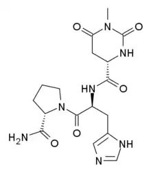 Taltirelin (marketed under the tradename Ceredist) is a thyrotropin-releasing hormone (TRH) analog, which mimics the physiological actions of TRH, but with a much longer half-life and duration of effects,[1] and little development of tolerance following prolonged dosing.[2] It has nootropic,[3] neuroprotective[4] and analgesic effects.[5]