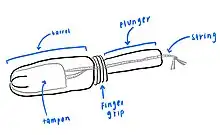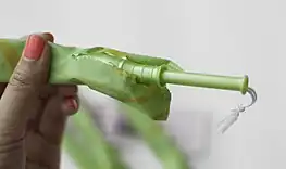 Tampon design varies between companies and across product lines in order to offer a variety of applicators, materials and absorbencies.[6] There are two main categories of tampons based on the way of insertion – digital tampons inserted by finger, and applicator tampons. Tampon applicators may be made of plastic or cardboard, and are similar in design to a syringe. The applicator consists of two tubes, an "outer", or barrel, and "inner", or plunger. The outer tube has a smooth surface to aid insertion and sometimes comes with a rounded end that is petaled.[7][8]