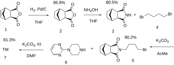 The catalytic hydrogenation of cis-5-Norbornene-exo-2,3-dicarboxylic anhydride [129-64-6] (1) gives Norbornane-2exo,3exo-dicarboxylic Acid-anhydride [14166-28-0] (2). Reaction with aqueous ammonia leads to Exo-2,3-norbornanedicarboximide [14805-29-9] (3). Alkylation with 1,4-dibromobutane [110-52-1] (4) gives CID:10661911 (5). Alkylation of the remaining halogen with 2-(1-Piperazinyl)Pyrimidine [20980-22-7] (6) completed the synthesis of Tandospirone (7).