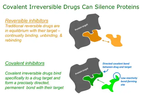 - ↑ Bauer RA (September 2015). "Covalent inhibitors in drug discovery: from accidental discoveries to avoided liabilities and designed therapies". Drug Discovery Today. 20 (9): 1061–1073. doi:10.1016/j.drudis.2015.05.005. PMID 26002380.