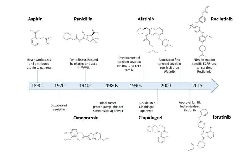 Over the last 100 years covalent drugs have made a major impact on human health and have been highly successful drugs for the pharmaceutical industry.[2] These inhibitors react with their target proteins to form a covalent complex in which the protein has lost its function. The majority of these successful drugs, which include penicillin, omeprazole, clopidogrel, and aspirin were discovered through serendipity in phenotypic screens.[3]