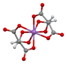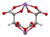 Antimony potassium tartrate has been the subject of several X-ray crystallography studies.[24][25][26][27][28][2] The core complex is an anionic dimer of antimony tartrate (Sb2(C4H2O6)22-) which is arranged in a large ring with the carbonyl groups pointing outwards. The complex has D2 molecular symmetry with two Sb(III) centers bonded in distorted square pyramids. Water and potassium ions are held within the unit cell but are not tightly bound to the dimer. The anion is a well-used resolving agent.[29]