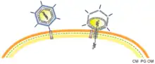 Mature virons are released by lysis, which, in the case of PRD1, is achieved with the aid of virus-encoded lysis machinery consisting of four proteins: P15 (endolysin),[5] P35 (holin),[6] P36 and P37 (homologues of the Rz/Rz1 proteins of phage lambda).[7]