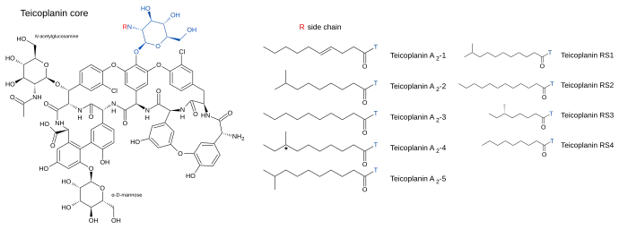 - ↑ Jung HM, Jeya M, Kim SY, Moon HJ, Kumar Singh R, Zhang YW, et al. (September 2009). "Biosynthesis, biotechnological production, and application of teicoplanin: current state and perspectives". Applied Microbiology and Biotechnology. 84 (3): 417–428. doi:10.1007/s00253-009-2107-4. PMID 19609520. S2CID 45038487.