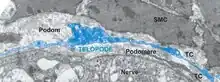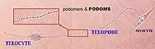Professor Laurențiu M. Popescu's group from Bucharest, Romania described a new type of cell. Popescu coined the terms telocytes (TC) for these cells, and telopodes (Tp)[2] for their extremely long but thin prolongations[2][3][4][5][6][7][8] in order to prevent further confusion with other interstitial (stromal) cells (e.g., fibroblast (FB), fibroblast-like cells, myofibroblast, mesenchymal cells). Telopodes present an alternation of thin segments, podomeres (with caliber mostly under 200 nm, below the resolving power of light microscopy) and dilated segments, podoms, which accommodate mitochondria, (rough) endoplasmic reticulum and caveolae - the so-called "Ca2+ uptake/release units". The concept of TC was promptly adopted by other laboratories, as well.[9][10][11][12][13][14][15][16][17][18][19]