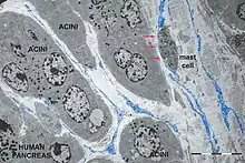 - ↑ Nicolescu, Mihnea I.; Popescu, Laurentiu M. (August 2012). "Telocytes in the Interstitium of Human Exocrine Pancreas: Ultrastructural Evidence". Pancreas. 41 (6): 949–956. doi:10.1097/MPA.0b013e31823fbded. ISSN 0885-3177. PMID 22318257. S2CID 23643116.