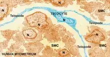 - ↑ Creţoiu, Sanda M.; Creţoiu, Dragos; Popescu, Laurentiu M. (November 2012). "Human myometrium - the ultrastructural 3D network of telocytes". Journal of Cellular and Molecular Medicine. 16 (11): 2844–2849. doi:10.1111/j.1582-4934.2012.01651.x. PMC 4118253. PMID 23009098.