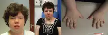 | A photo showing person with Temple syndrome, with small hands, short philtrum and a broad nose. | |