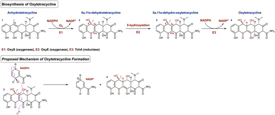 After the formation of anhydrotetracycline, ATC monooxygenase (OxyS) oxidizes the C-6 position in an enantioselective manner in the presence of the cofactor NADPH and atmospheric oxygen to produce 5a,11a-dehydrotetracycline.[12] Next, a hydroxylation occurs at the C-5 position of 5a,11a-dehydrotetracycline via the oxygenase encoded as OxyE in the oxytetracycline gene cluster. This produces the intermediate 5a,11a-dehydro-oxytetracycline. However, the exact mechanism of this step remains unclear. The final step of this biosynthesis occurs through the reduction of a double bond in the α, β—unsaturated ketone of 5a,11a-dehydro-oxytetracycline. In this final step, the cofactor NADPH is employed by TchA (reductase) as the reducing agent. Upon reduction, the enol form is favored due to conjugation, thus producing the aromatic polyketide oxytetracycline. Figure 2 shows the biosynthesis as described above, as well as an arrow-pushing mechanism of NADPH being used as the final cofactor in the biosynthesis of oxytetracycline.